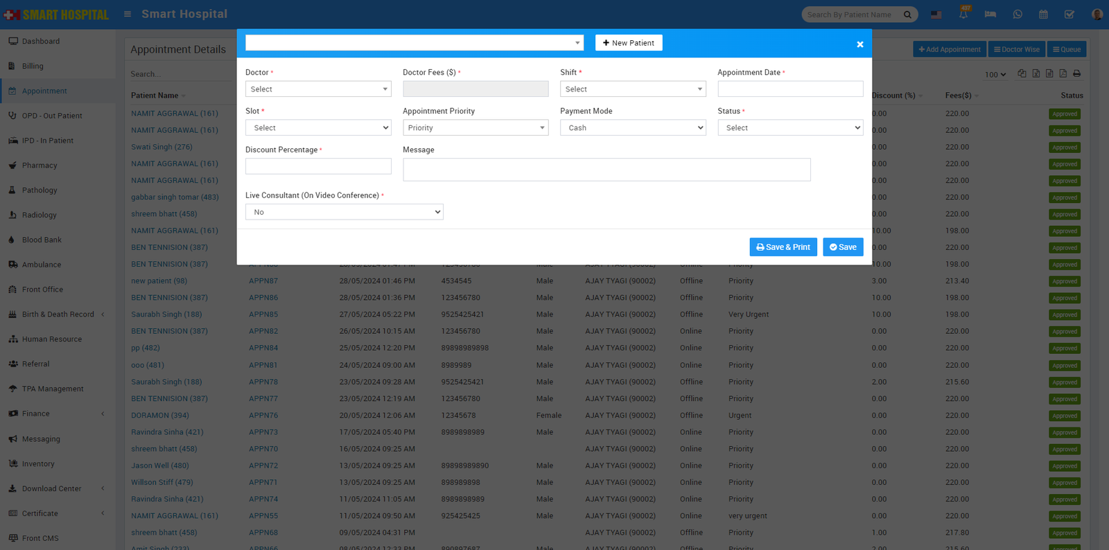 To add new appointments go to Appointment link present at the left side menu then click on + Add Appointment button. Here select existing patient from Select Patient dropdown (or you can create new patient record from +New Patient) then enter Doctor, Docter Fees (auto fill on Doctor's selection), Shift, Appointment Date, Slot, Appointment Priority, Payment Mode, Status (Pending, Approved or Cancel), Discount Percentage, Message (optional), Live Consultant(On Video Conference) then click on Save & Print or Save button.