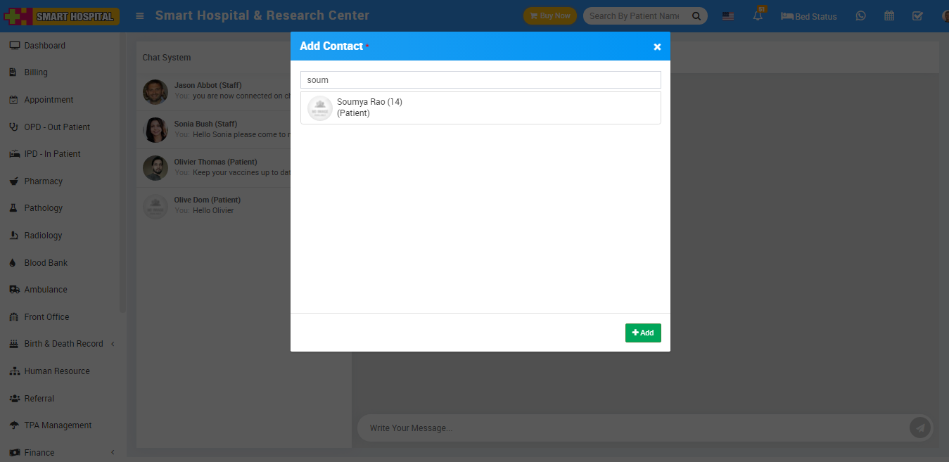 Now click on + icon present in the chat system page, at click of this icon Add Contact modal will be open. Here search the patient whom you want to add and then click on Add button. You can view this added patient on the chat system page.