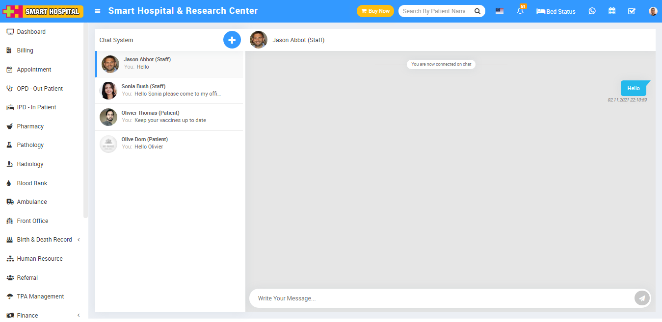 Now to start chat click on the member name (staff, patient) from chat system, at click of the name a member's chat window will open, here enter the message and click to Send button. You can also check new messages in the chat system.