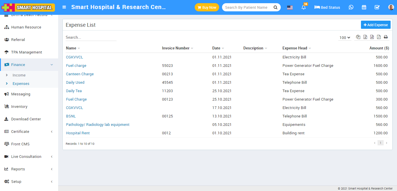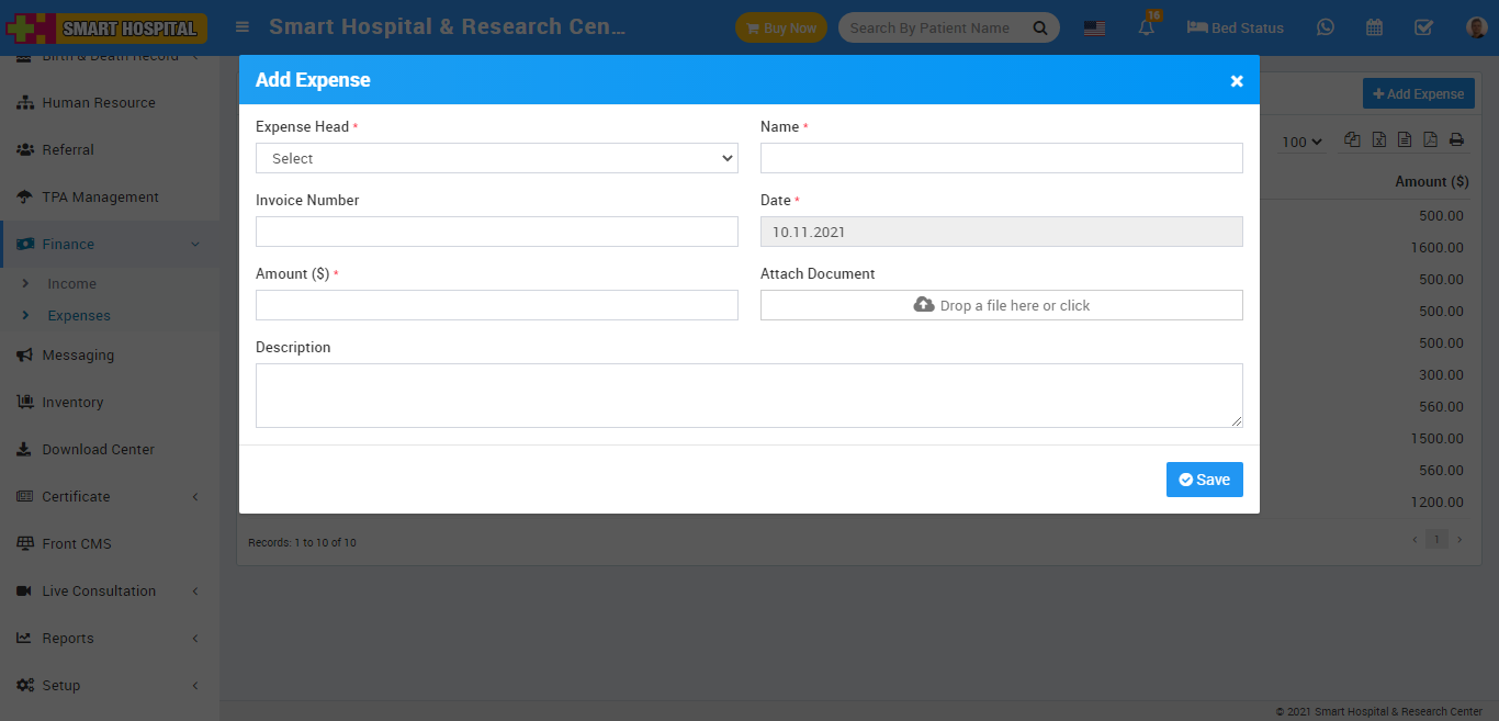 Here we can manage all expenses coming from different Expense Heads. To add new expense click on + Add Expense button here enter Expense Head, Name, Invoice Number, Date, Amount, Attach Document and Description then click on Save button.