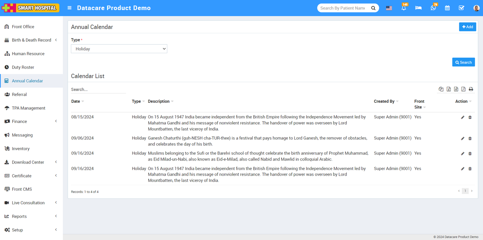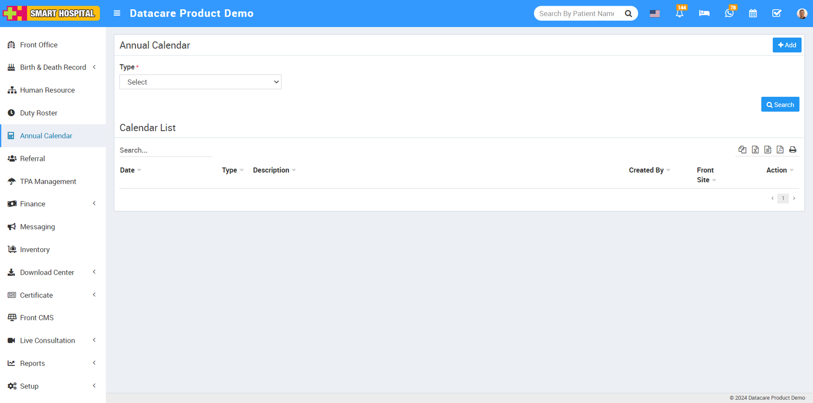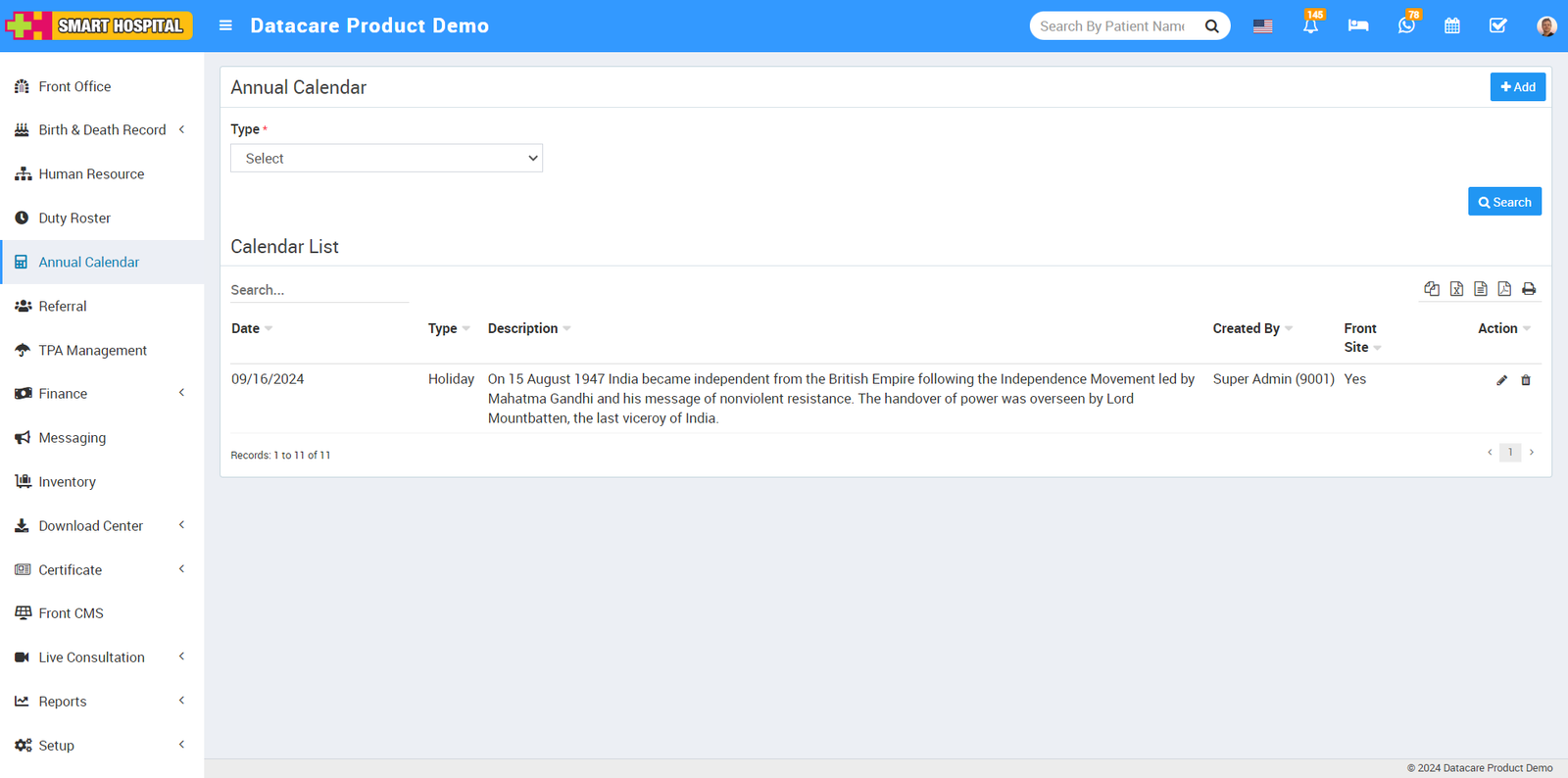 To add a holiday to the annual calendar, go to the Annual Calendar module in your Smart Hospital system and click on it. The Annual Calendar page will open on the right side.