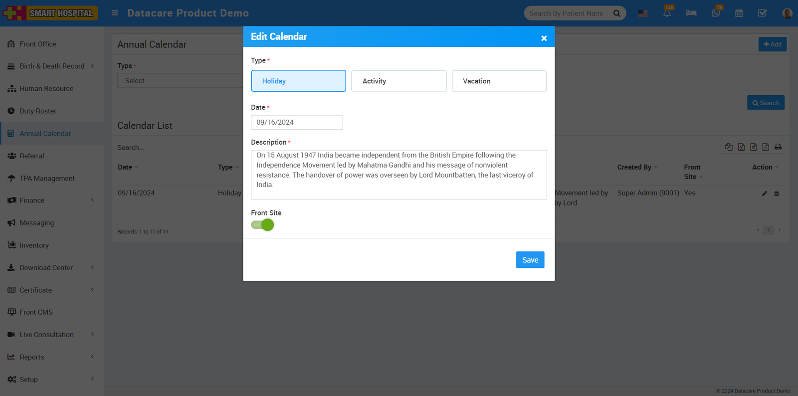 Now go to the Add button, showing at the top right corner and click on it, Add window will be open In this window, you can see options for Type: Holiday, Activity, and Vacation. Simply select 'Holiday' by clicking on it, then choose the date when the holiday will occur. Add a description of the holiday, and if you want to display this holiday with details on the front site of your Smart Hospital, click on the 'Front Site' button.