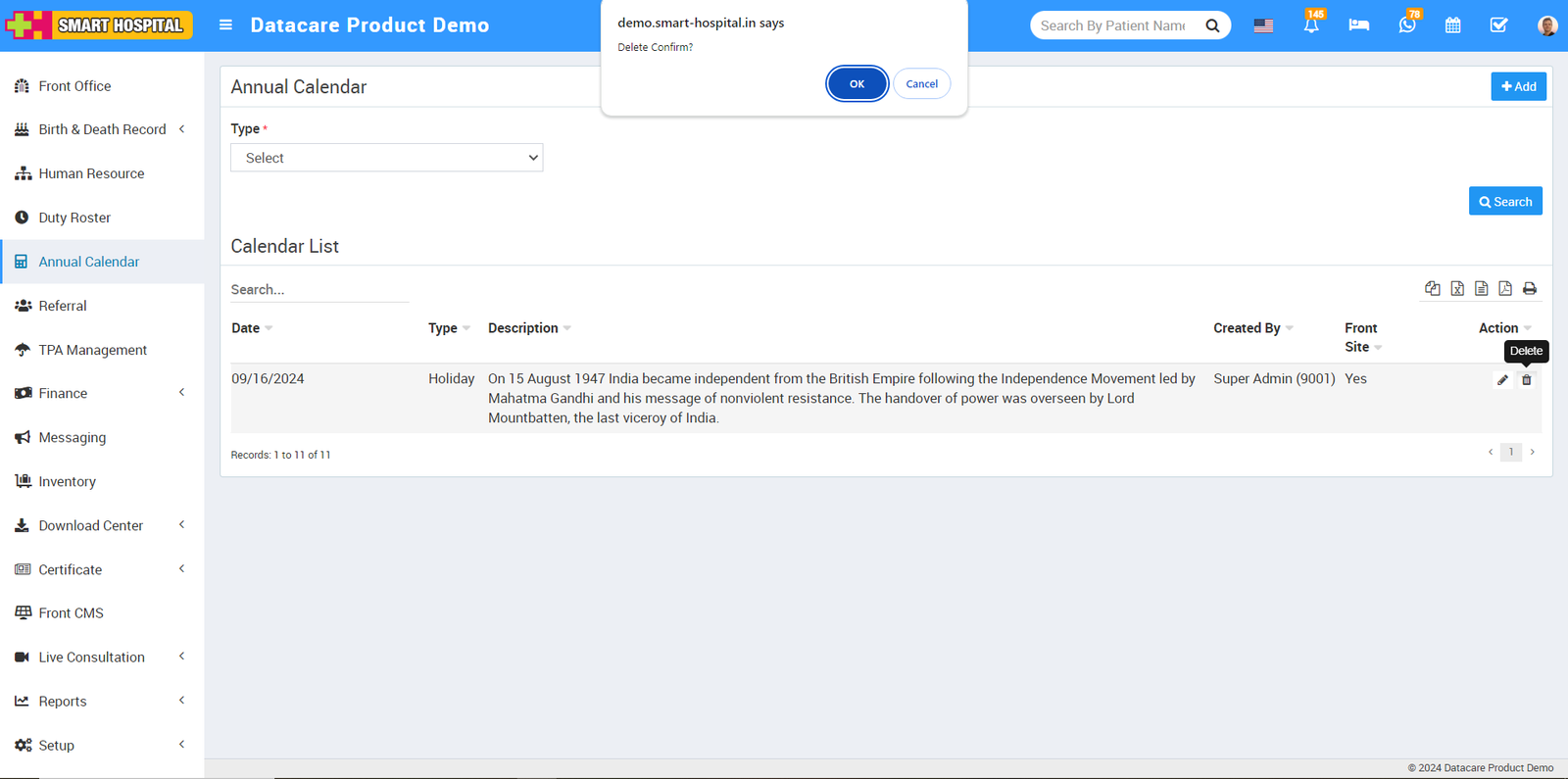 To delete the holiday details, simply click on the delete icon on the right side, then click the 'OK' button. The holiday details will be deleted successfully