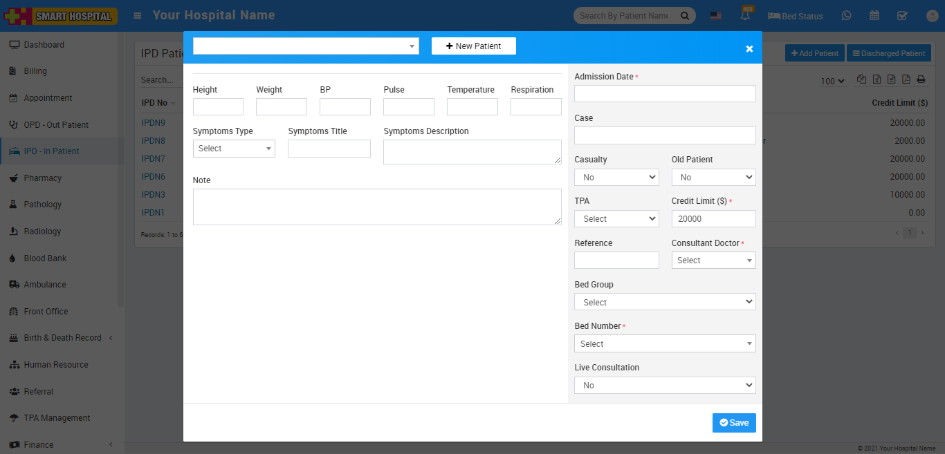 To add new OPD patient click on + Add Patient button. select Patient Name from dropdown or click on + New Patient button to add new patient then enter Admission Date, Case, Casualty, Old Patient, TPA (Third Party Administrator), Credit Limit, Reference, Consultant Doctor, Bed Group, Bed Number and select Live Consultation (if yes than live consultation for the patient will create and it will list on IPD patient profile Live Consultation tab).