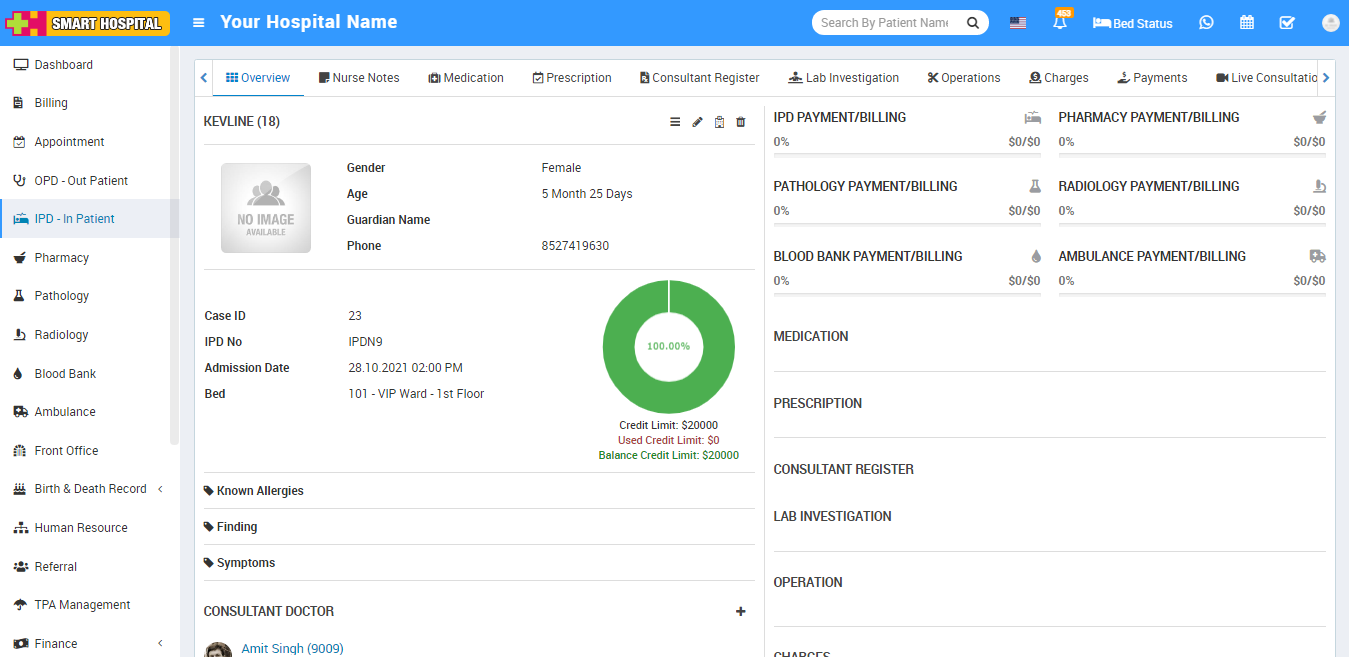 IPD (In Patient Department) module is for managing those patient who admit in hospital for their issues/disease treatment.