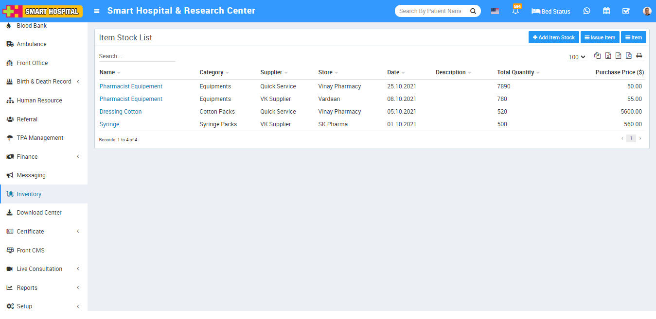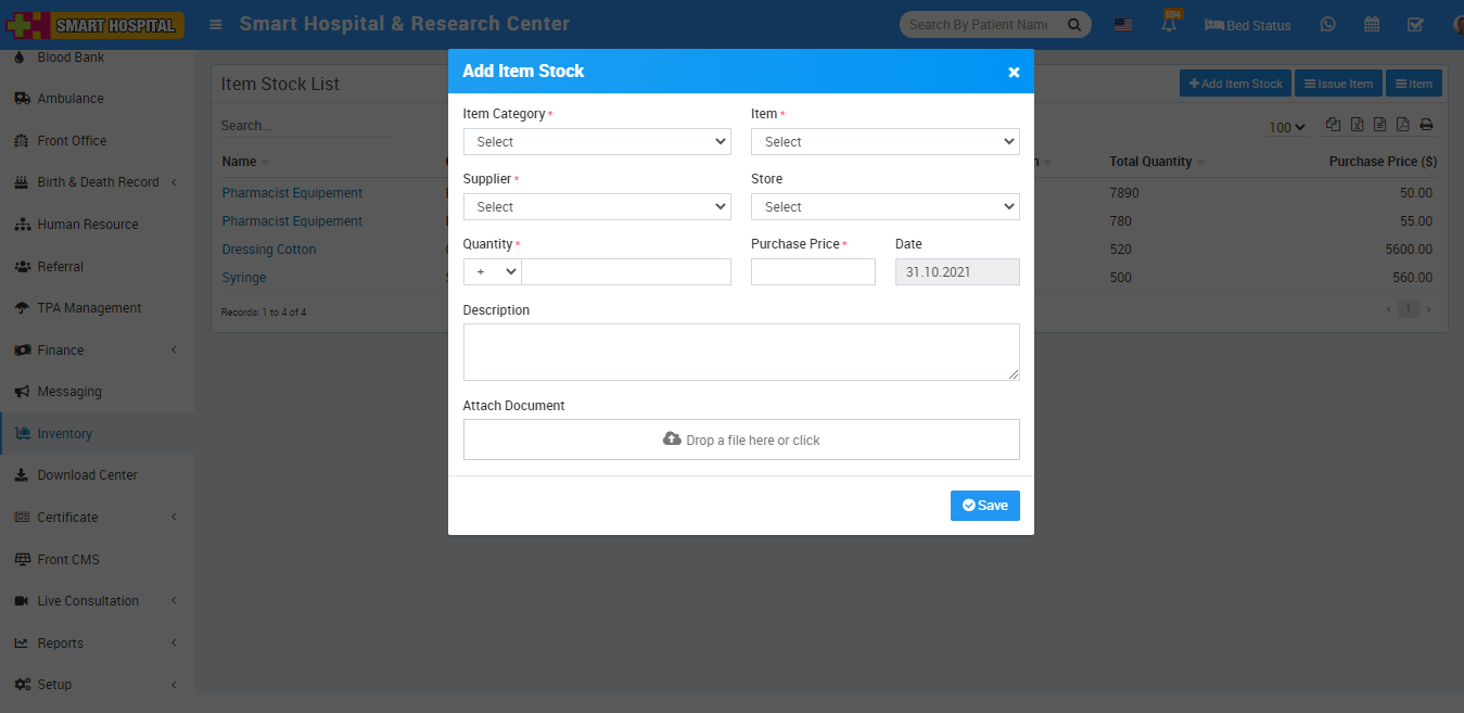 To add item stock go to inventory click on + Add Item Stock button, here enter Item Category, Item Name, Supplier, Store, Quantity, Purchase Price, Date, Description and Attach Document and then click on Save button.