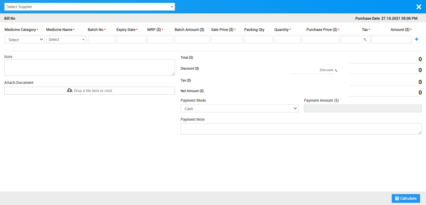To add purchased medicine details click + Purchase Medicine button now here enter Supplier name, Purchase Date, Medicine Category, Medicine Name, Batch No, Expiry Date, MRP($), Batch Amt, Sale Price($), Packing Qty, Quantity, Purchase Price($), Amount($), Note, Attach document, Discount, Tax. After filling all relevant details, click on calculate button then final amount will be calculated then click on Save button.