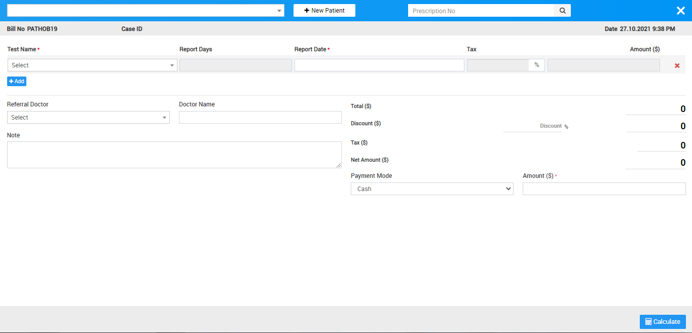 To add patient test report for a pathology test, first you need to generate a Pathology Test bill. So to generate pathology test bill click on + Generate Bill button present at Pathology page here enter Patient (patient can be added here in three ways 1. Search for patient at search area. 2. Add new patient through +New Patient and 3. Enter Prescription No. so patient details with prescribed test will auto fill at generate bill), Test Name, Reports Days, Report Date, Tax, Amount, Hospital Doctor and Doctor Name, custom field details (if any) then after adding all pathology test details enter Discount and Tax if any, to calculate final bill click on Calculate button then click on Save button. After this, bill will be display on Pathology page.
