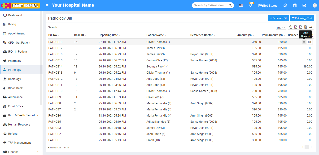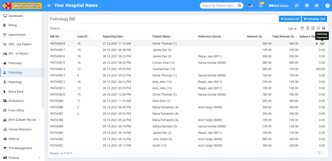 Now after generate pathology bill there two option will be show these are View Reports and Add/View Payment.