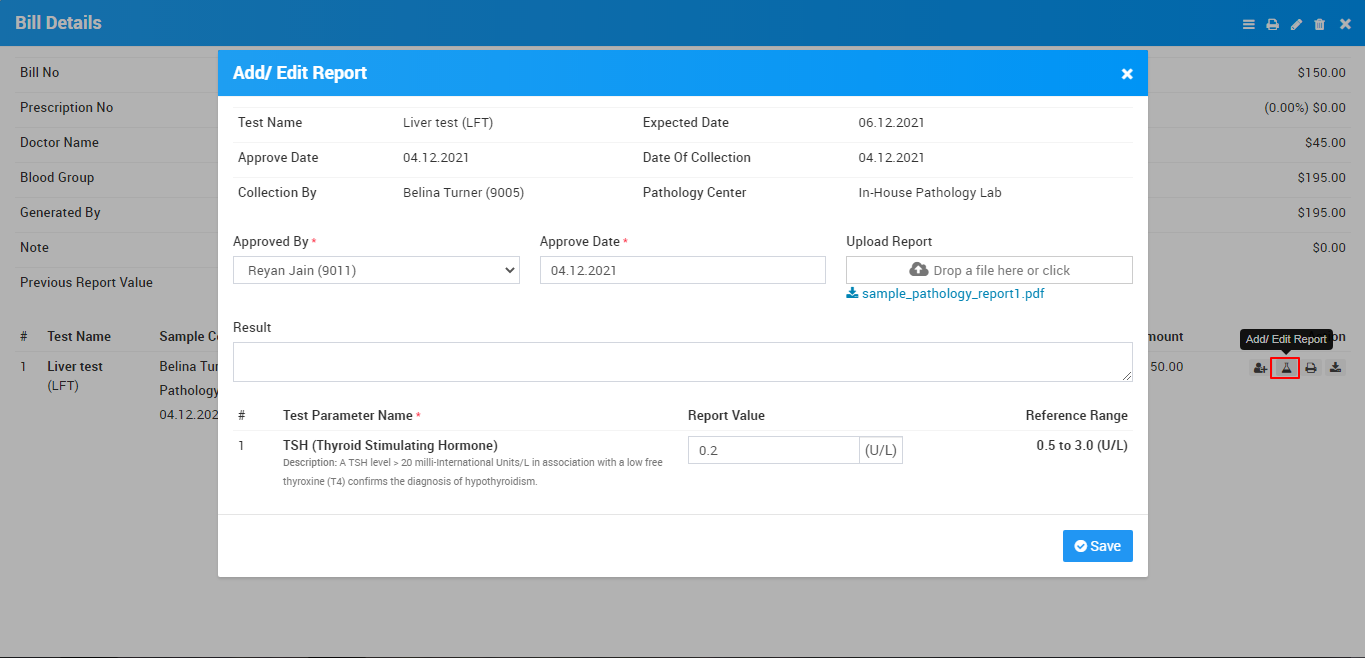 To Add/Edit patient test result click on Add/Edit Report button icon present at View Report page. Here you can add Approved By, Approved Date, Upload Report and Test Parameter Value at Report Value text area then click on Save button.