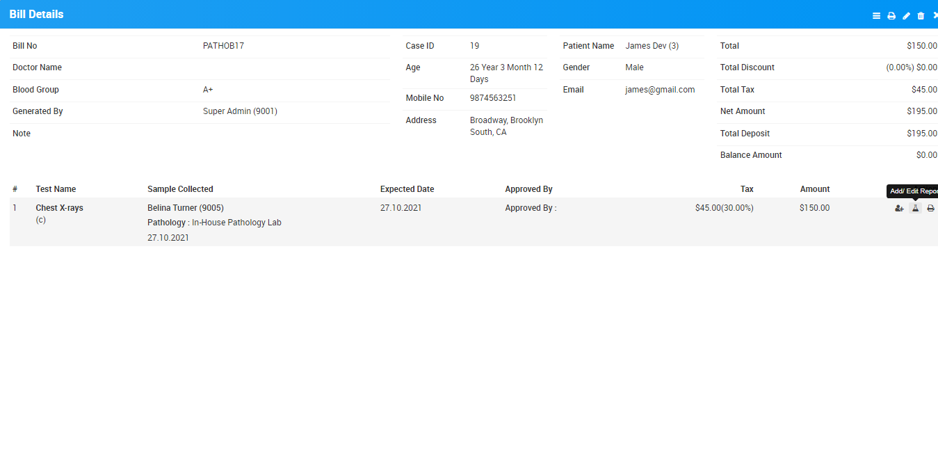 Once you have added Collection Person details and click on Save button so you will see one more option at bill detail page which is Add/Edit Report from this option radiologist/staff can add patient test result report.