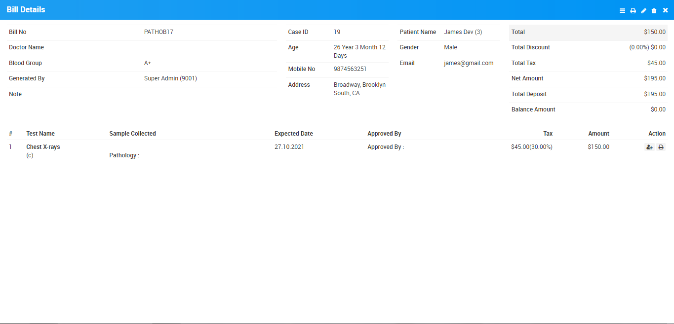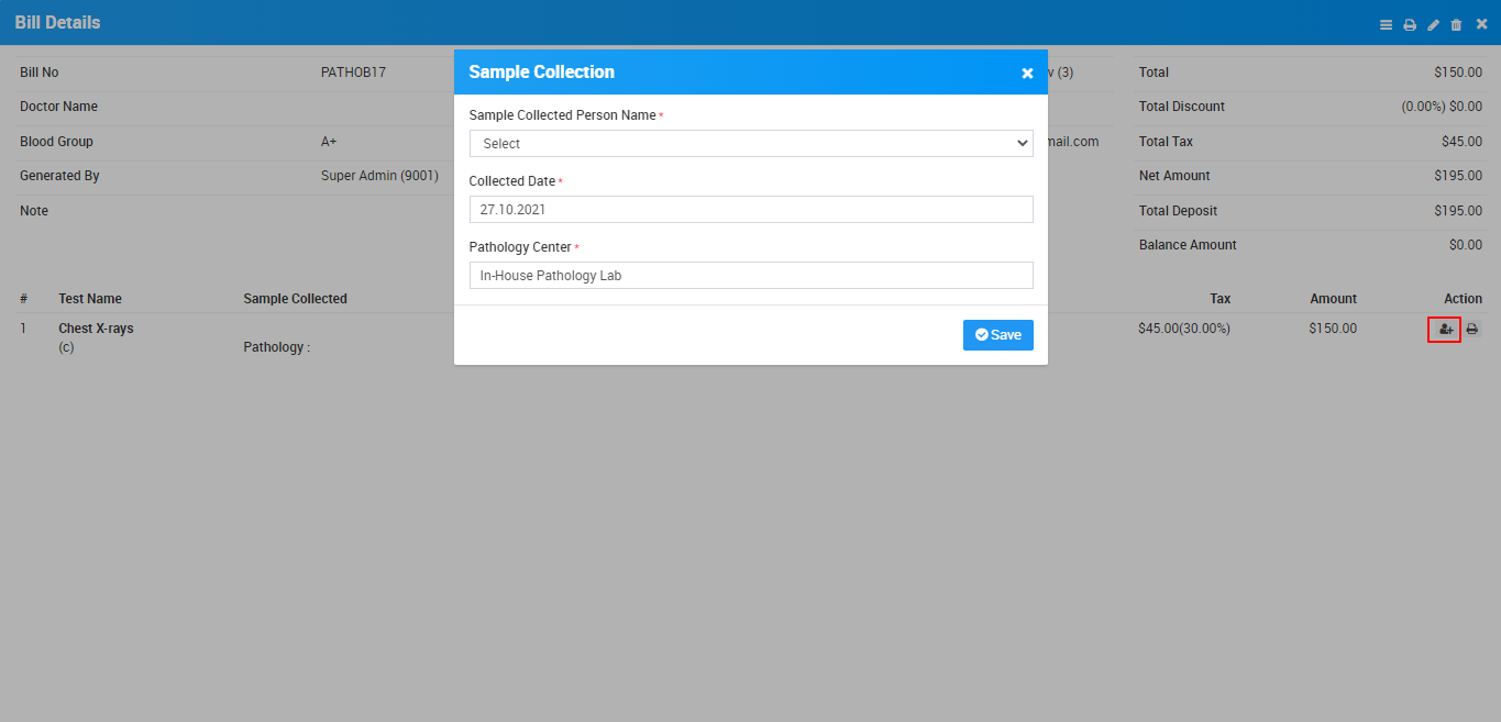 There is one more section at Bill Details under test details section where you can add/edit Sample Collection Person details and Print Report.