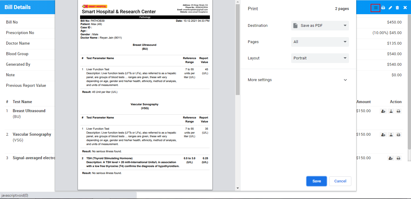Now to print Pathology Test report click on Print button present at Action column at Test details under View Report page.