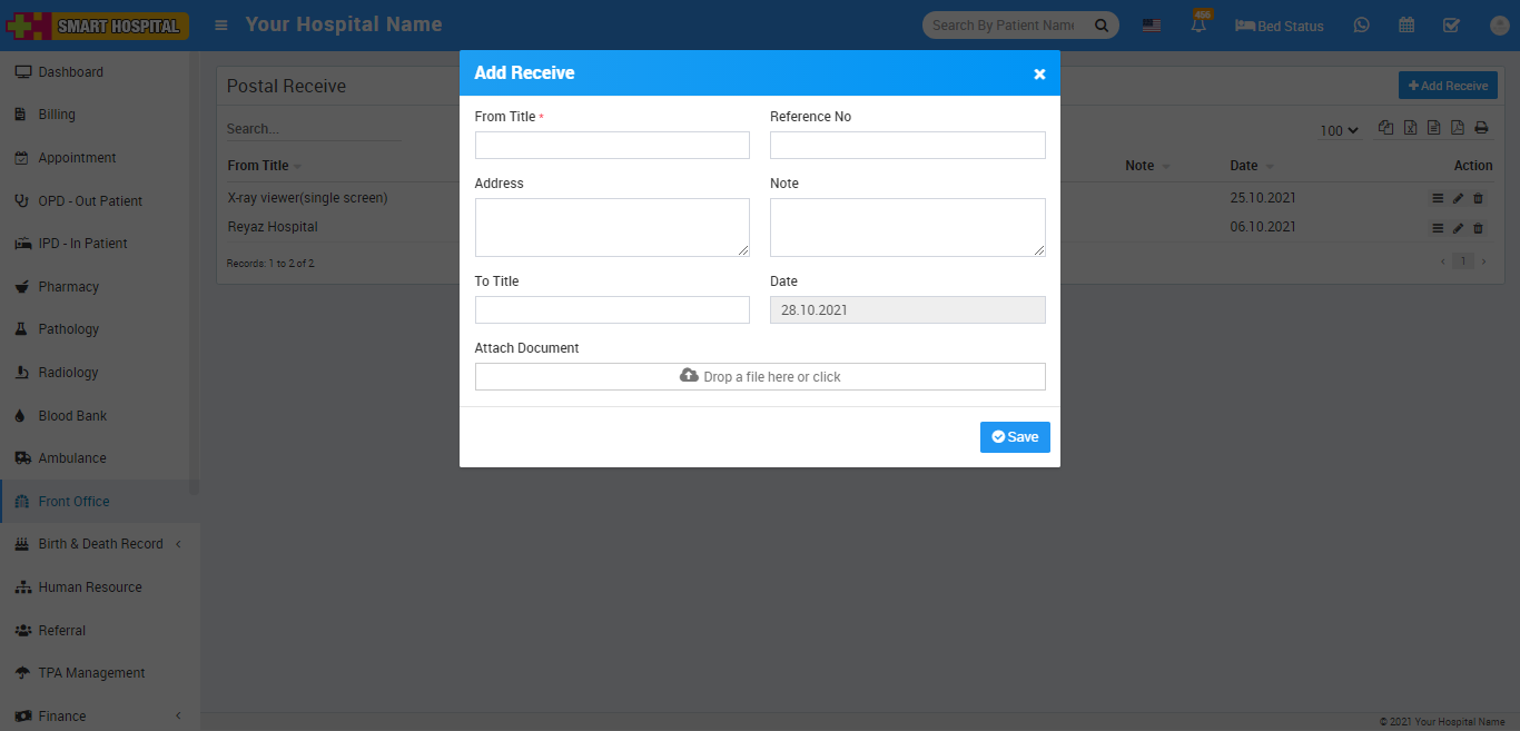 Postal Receive is for managing postal inward documents for managing postal receive click on Postal Receive button. To add Postal Receive click on + Add Receive button now here enter From Title, Reference Number, Address, Note, To Title, Date, Attach Document if any.