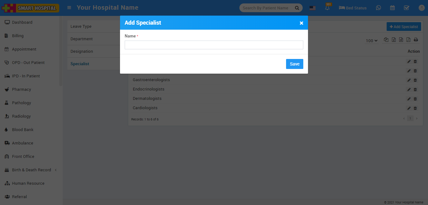 To add Specialist, go to Setup > Human Resource > Specialist then enter Name and then click on Save button.