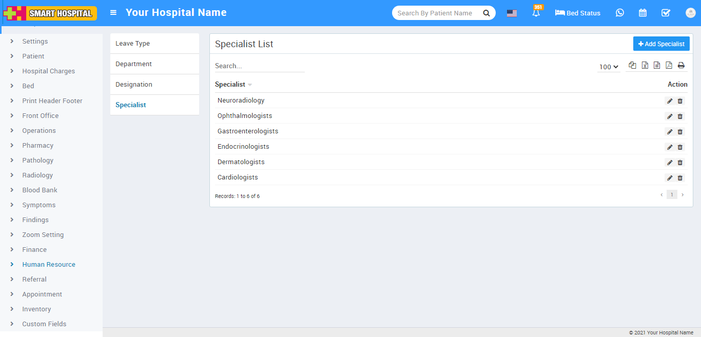 To edit specialist click on Edit icon and to delete department click on Delete icon present in the Specialist list.