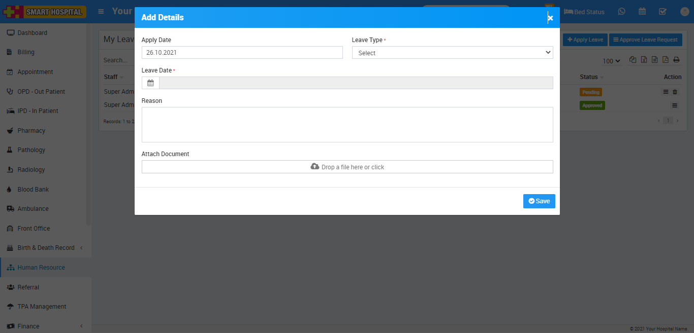To apply leave, go to Human Resource > Approve Leave Request > Apply Leave then click on the Apply Leave button present at top right corner in leaves page, at click of this button Add Details modal will be open. Here select Apply Date, Available Leave, Leave Date, Reason and Attach Document and then click on Save button.