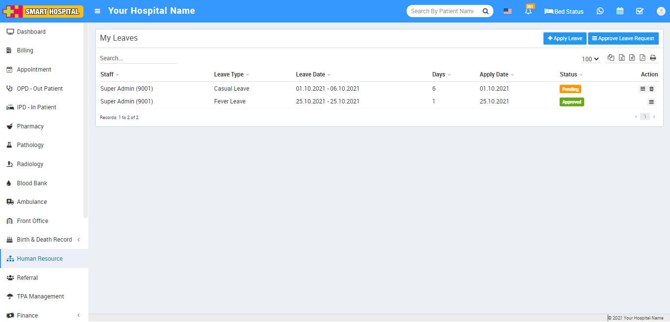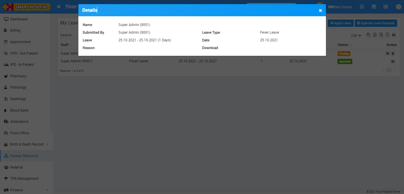 To view apply leave click on View icon present at Action column in the leaves page, at click of this icon Details modal will be open. Here you can see the details of staff member.