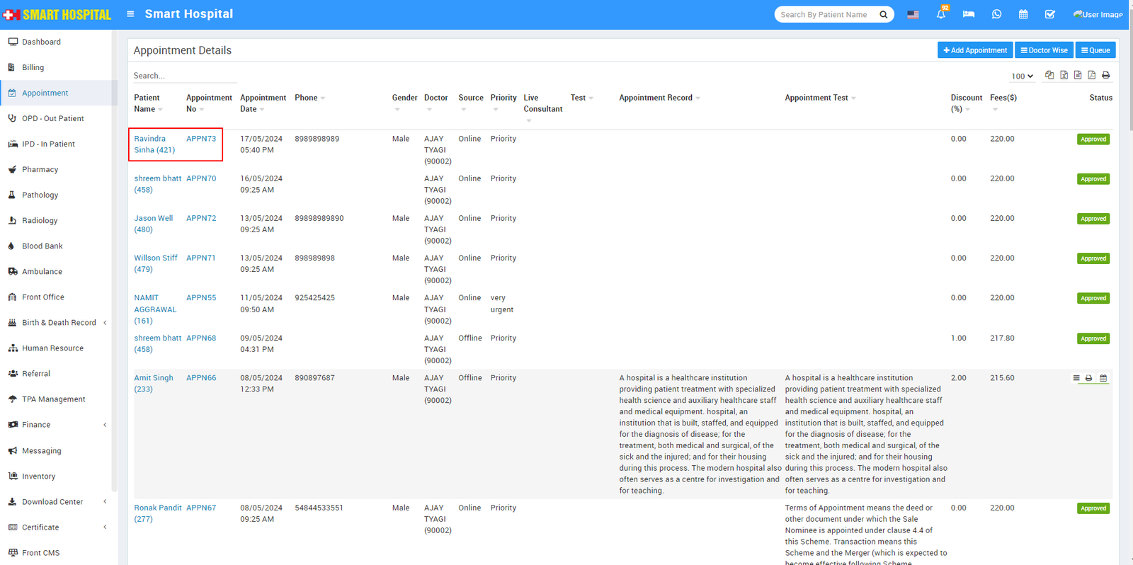 In appointment details list, here you will see the multiple column's are available, if you want to open the patient details, simply go to the Patient Name and Appointment No column and click on either the Patient Name or Appointment No, that particular patient detail will be open