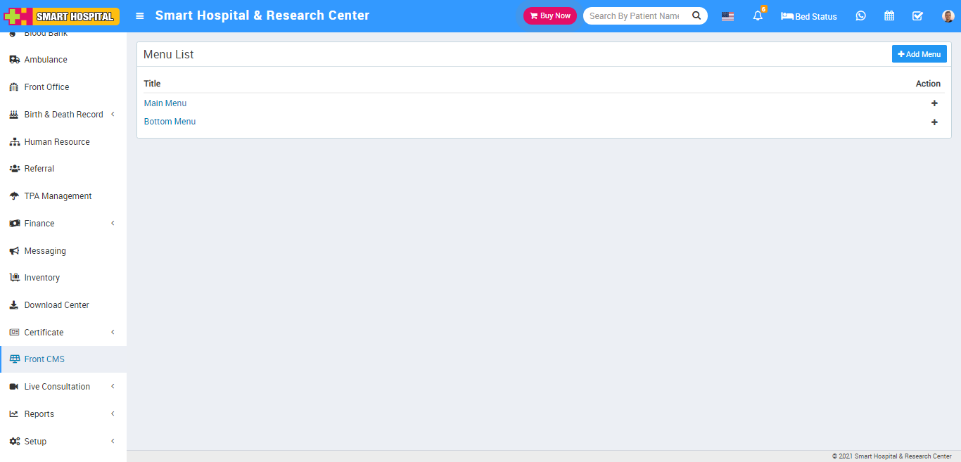 To enable Online Appointment for front site, go to Front CMS > Menus, then click on the + icon of Main Menu, this will redirect you in Add Menu Item page, here you will see all menu item list.