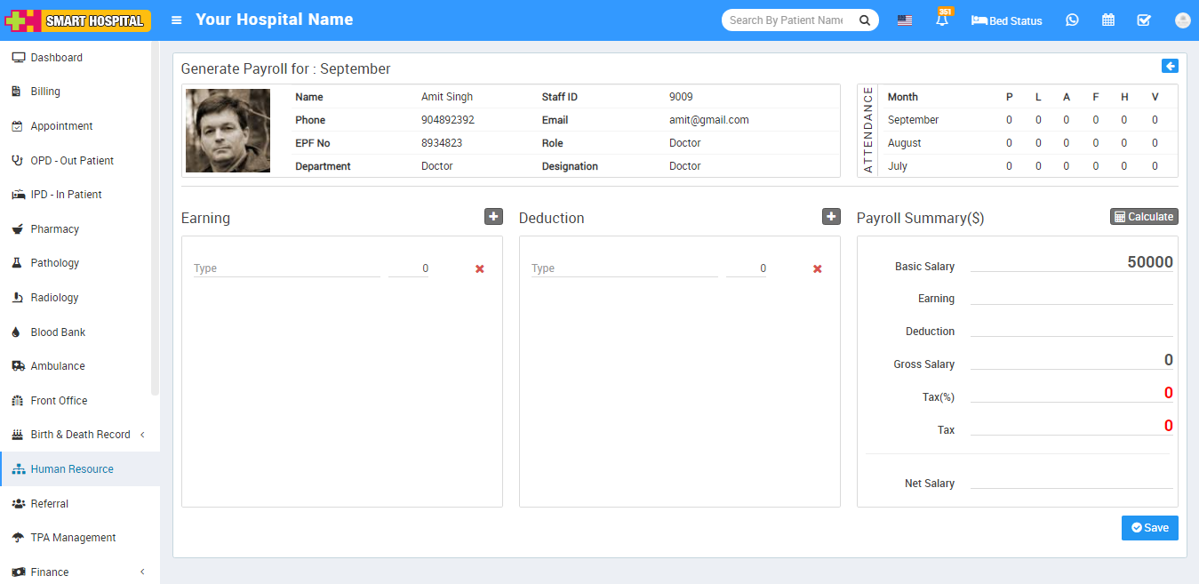 To view staff member basic salary, click on Calculate button present in Payroll Summary column. Here you can see salary details and then click on Save button.