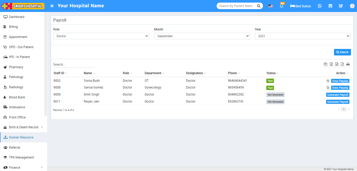 To generate payroll for staff members, go to Human Resource > Payroll then select Role, Month and Year and then click on Search button. Here you can see staff member list and their payroll status and current salary from action column.