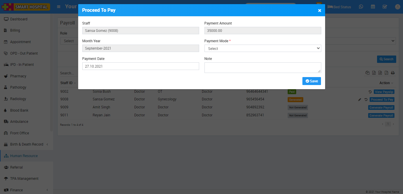 Now click on Proceed To Pay button present at Action column in staff list, at click of this button Proceed To Pay modal will be open. Here you can see Staff Name, Payment Amount, Month Year and select Payment Mode, Payment Date, Note and then click on Save button.