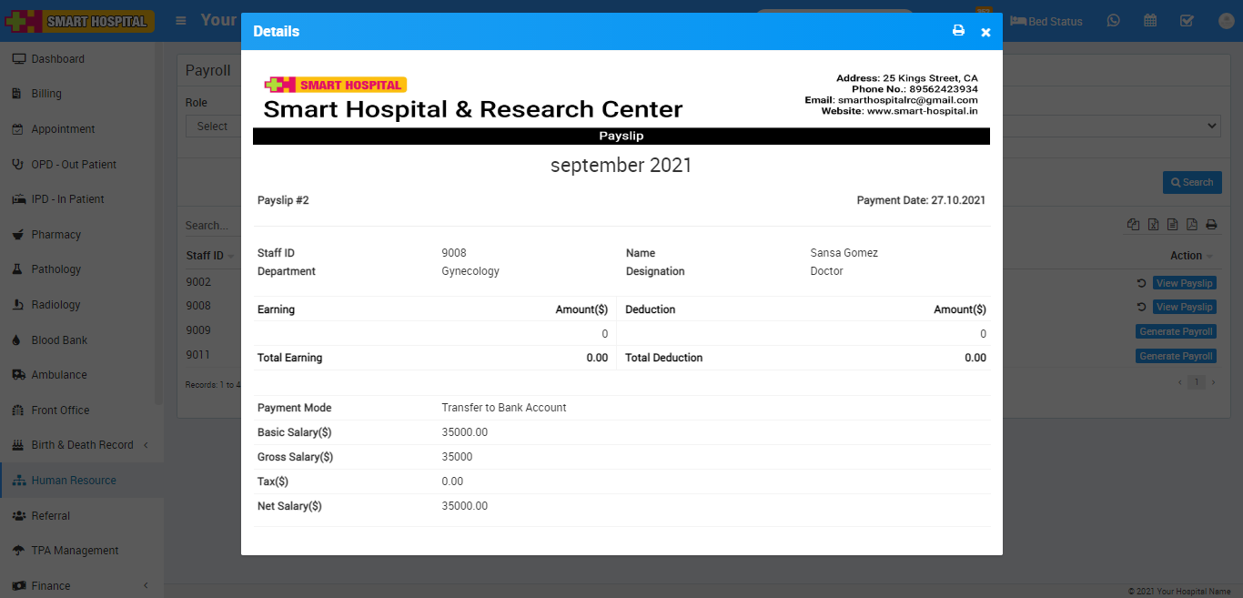 Now click on View Payslip button present at Action column in staff list, at click of this button Details modal will be open. Here you can see staff payslip details.