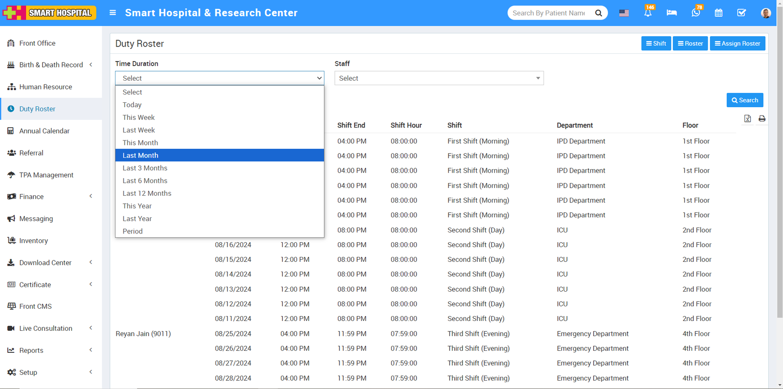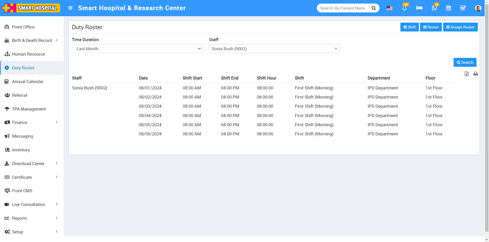 To search duty roster using time duration and staff, log in to the Smart Hospital. After logging in, go to the Duty Roster module and click on it. The Duty Roster page will open on the right side