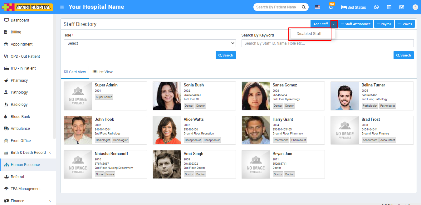 To view disabled staff, go to Human Resource > Add Staff > Disabled Staff then select Role and then click on Search button. You can also search any disabled staff by entering any matching Keyword in the Search By Keyword Text Box and then click on Search button. The list of disabled staff will be shown below of the page.