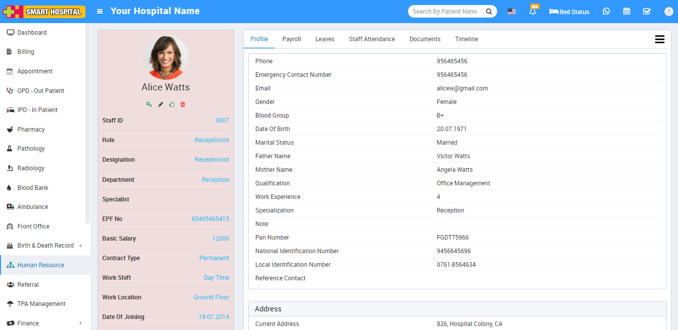 To view staff details click on Show icon present in staff card. Here you can view basic detail of staff like Profile, Payroll, Leaves, Attendance, Documents, Timeline.