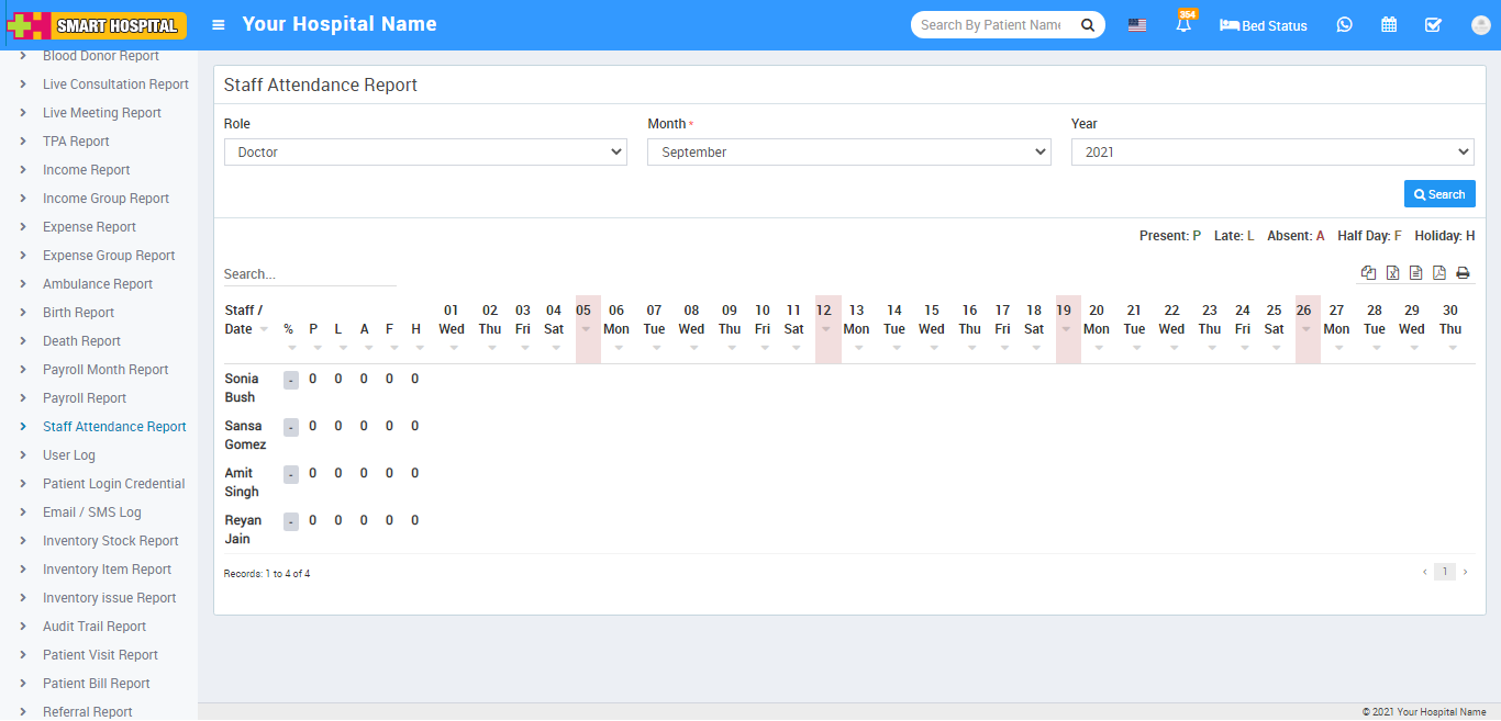 To check staff report, go to Report > Staff Attendance Report click on Staff Report. Here select Role, Month and Year then click on Search button. Here you can see staff attendance date wise.