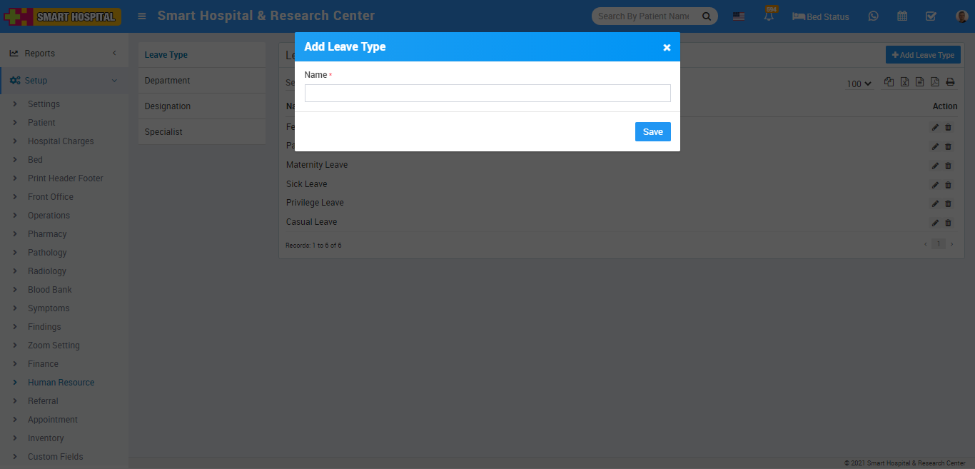 To add Leave Type click on + Add Leave Type button now enter Name and click on Save button.