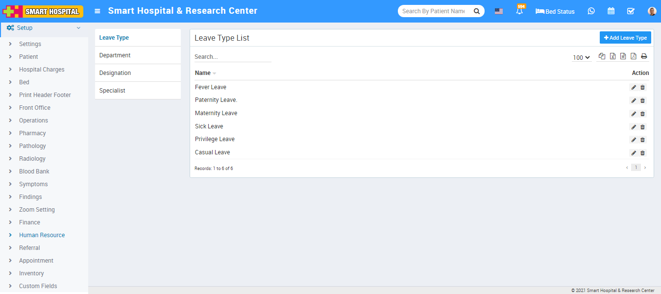 To edit Leave Type click on edit and to delete Leave Type click on delete icon present at Action column.