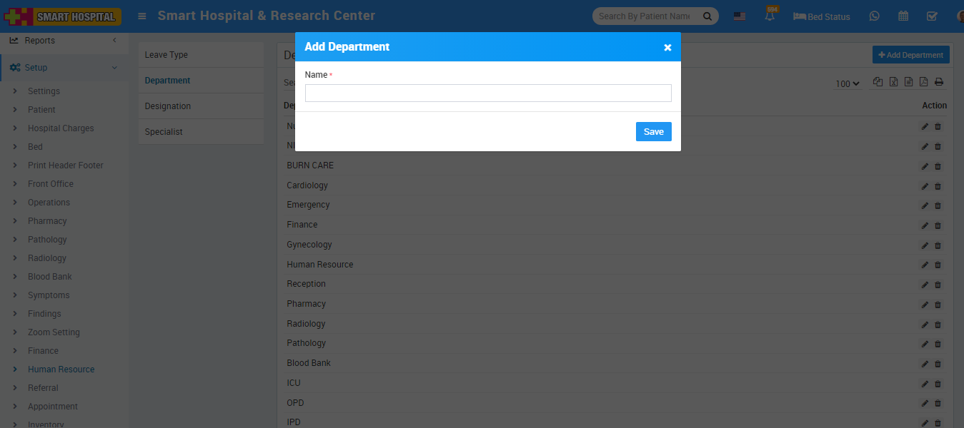 To add Department click on + Add Department button now enter Name and click on Save button.