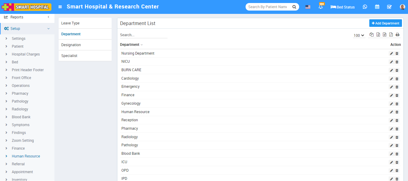 To edit Department click on edit and to delete Department click on delete icon present at Action column.