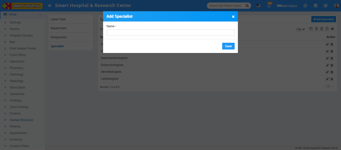 To add Specialist click on + Add Specialist button now enter Name and click on Save button.