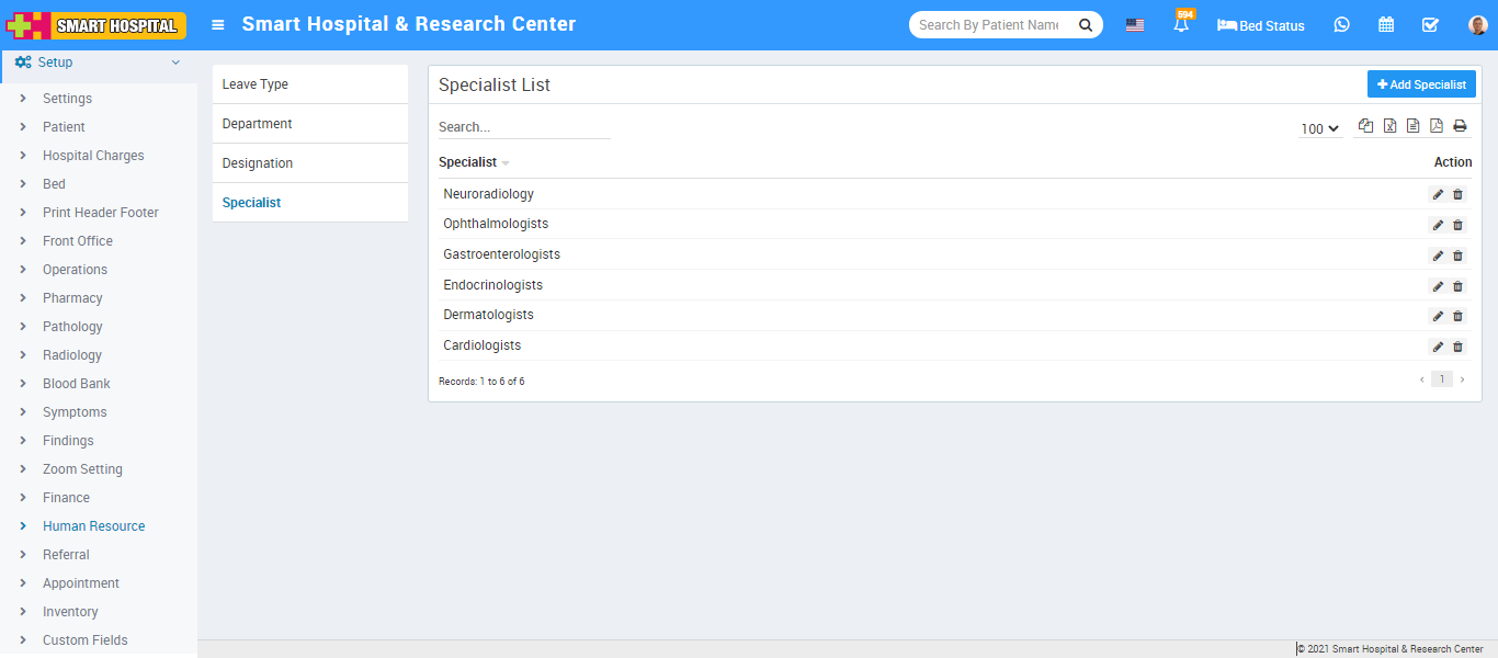 To edit Specialist click on edit and to delete Specialist click on delete icon present at Action column.
