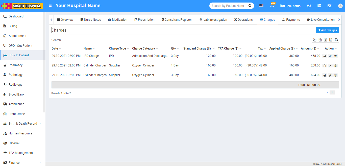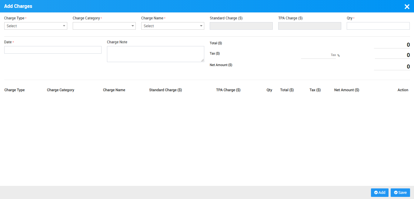 Now click on Charges tab. Here to add charges for IPD patient click on +Add Charges button, here you should add Charge Type, Charge Category, Charge Name and other details and click on Save button.