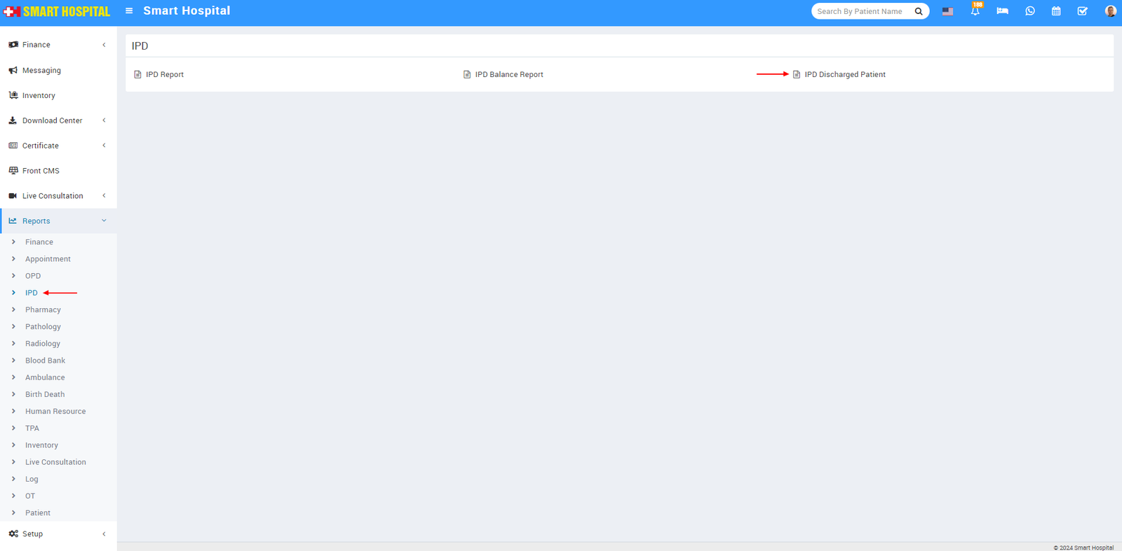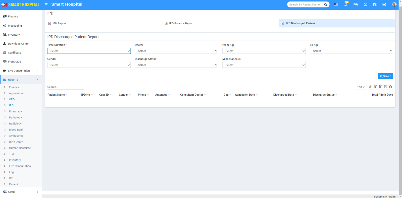 Here select the Time Duration, Doctor, From Age, To Age, Gender, Discharge Status then click on Search button. Here you can see IPD Discharge Patient details like Patient Name, IPD No, Case ID, Gendar, Phone, Consultant, Bed, Admission Date, Discharge Date, Discharge Status, Total Admit Days etc. Also you can download this report as PDF.