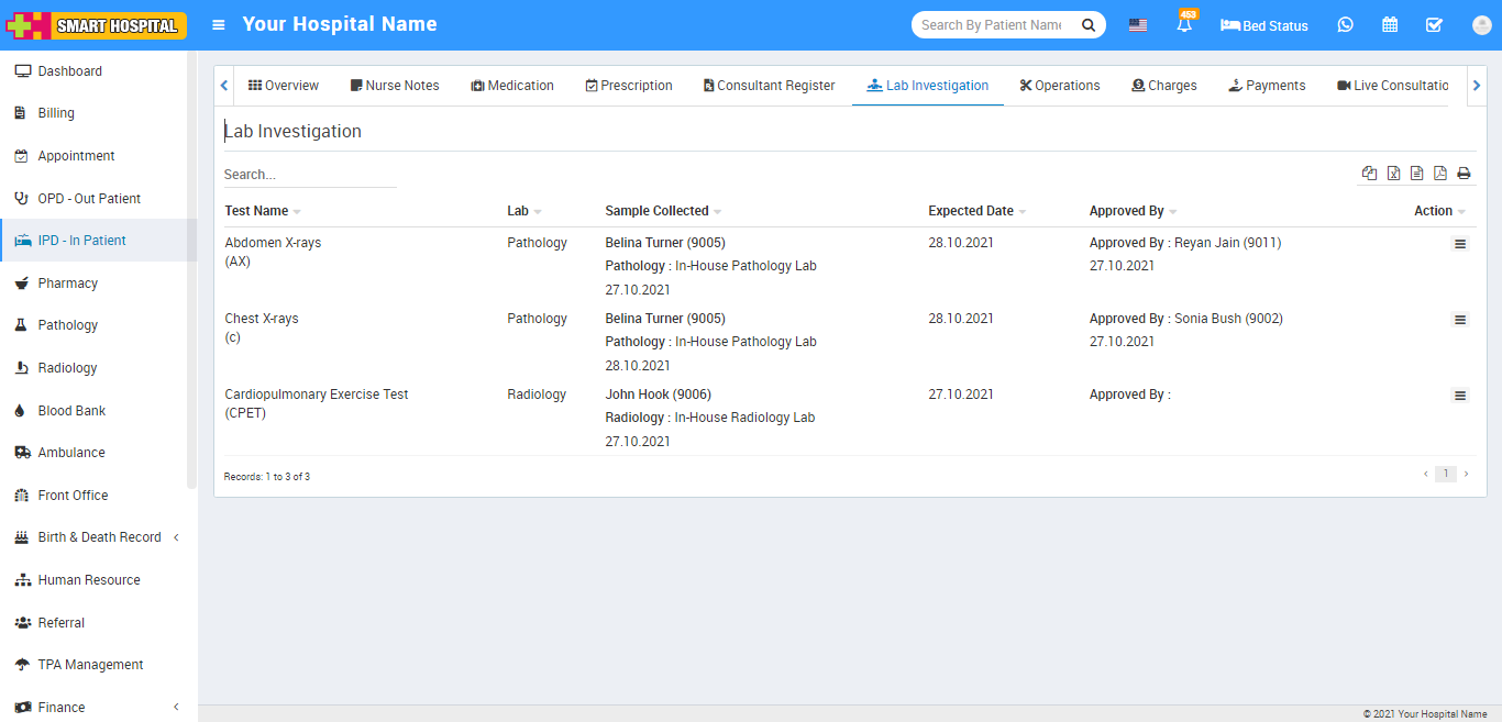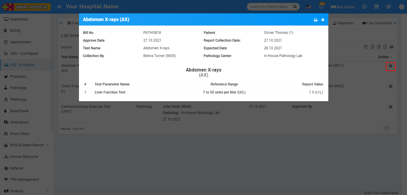 In IPD patient list you can also check patient all Pathology and Radiology test under Lab Investigation tab.