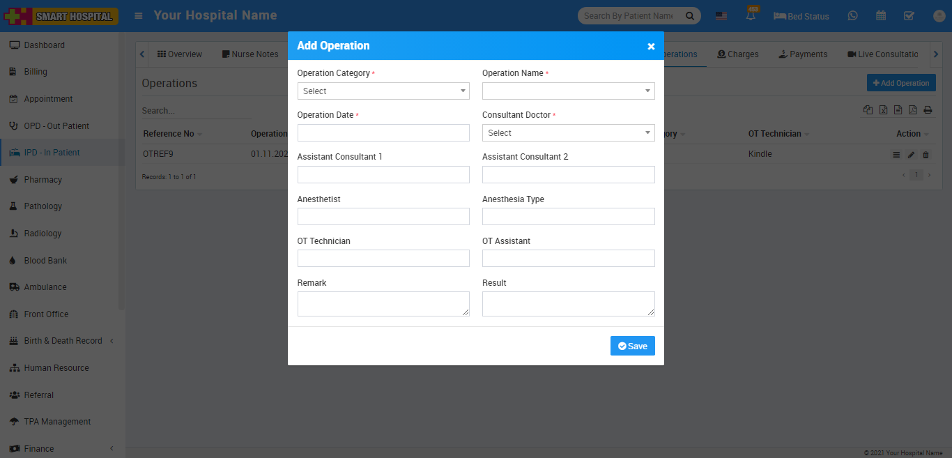 To add operation record click on +Add Operation button here enter Operation Category, Operation Name (click here to see how to add operation category and name in Smart Hospital), Operation Date, Consultant Doctor, Assistant Consultant 1, Assistant Consultant 2, Anesthetist, Anesthesia Type, OT Technician, OT Assistant, Remark, Result then click on Save button.