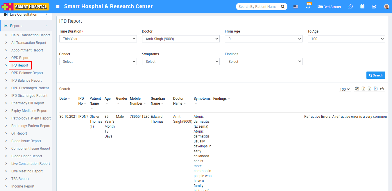 To check patient IPD report, go to Reports > IPD Report. Here select the Time Duration, Doctor, From Age, To Age, Gender, Symptoms and Findings then click on Search button. Here you can see patient IPD details like IPD No, Patient Name, Age, Gender, Mobile Number, Guardian Name, Doctor Name, Symptoms, Findings etc.