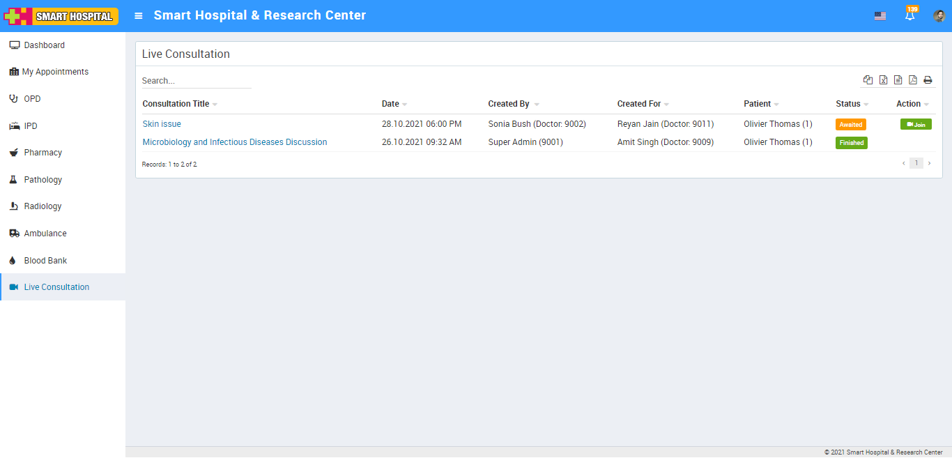 Here all the Live Consultation like from Appointment, OPD and IPD modules for patients will be listed.
