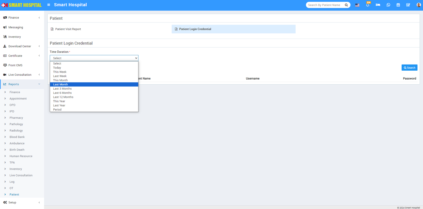 Now click on Patient Login Credential, in below Time Duration drop down will be open, using this drop down you can search and get the details of that time duration