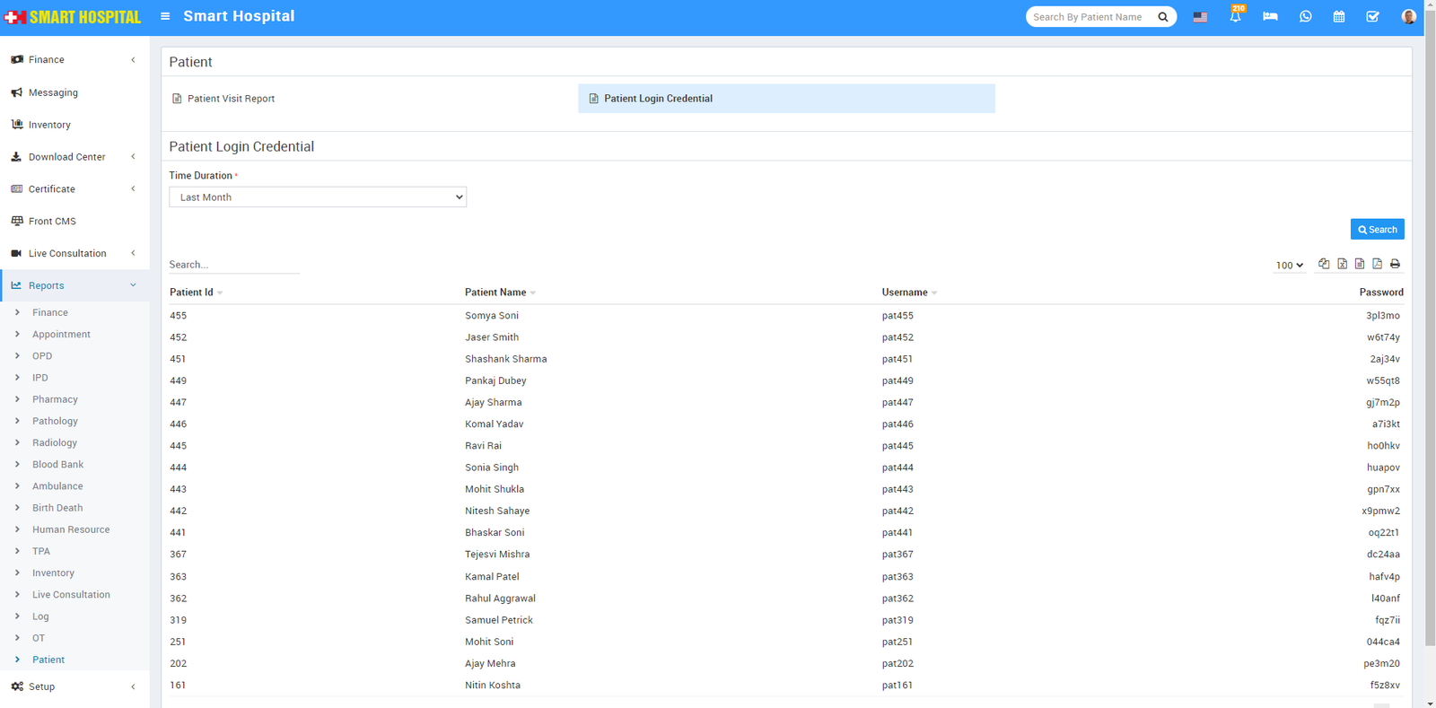 Patient Login Credential, Here you can see Patient Login Credential details like Patient Id, Patient Name, Username and Password etc. Also you can download this report as PDF.