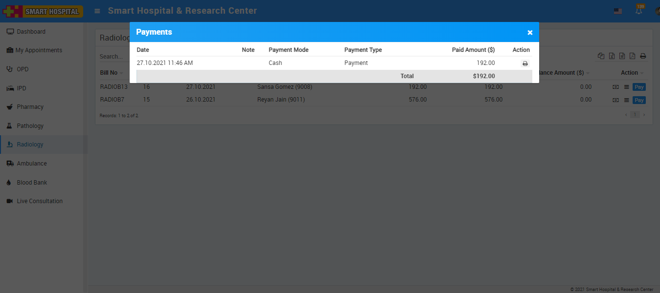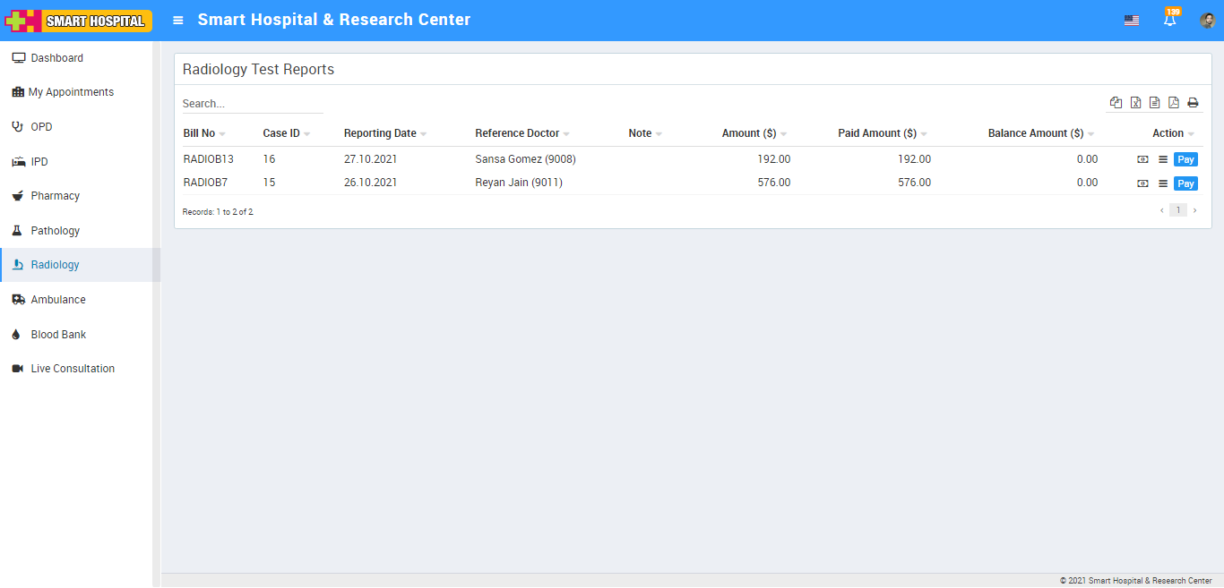 To make online payment for Radiology click on Pay button here you can edit payment and click on add button, this will redirect you to payment gateway from where you can make online payment for Radiology.