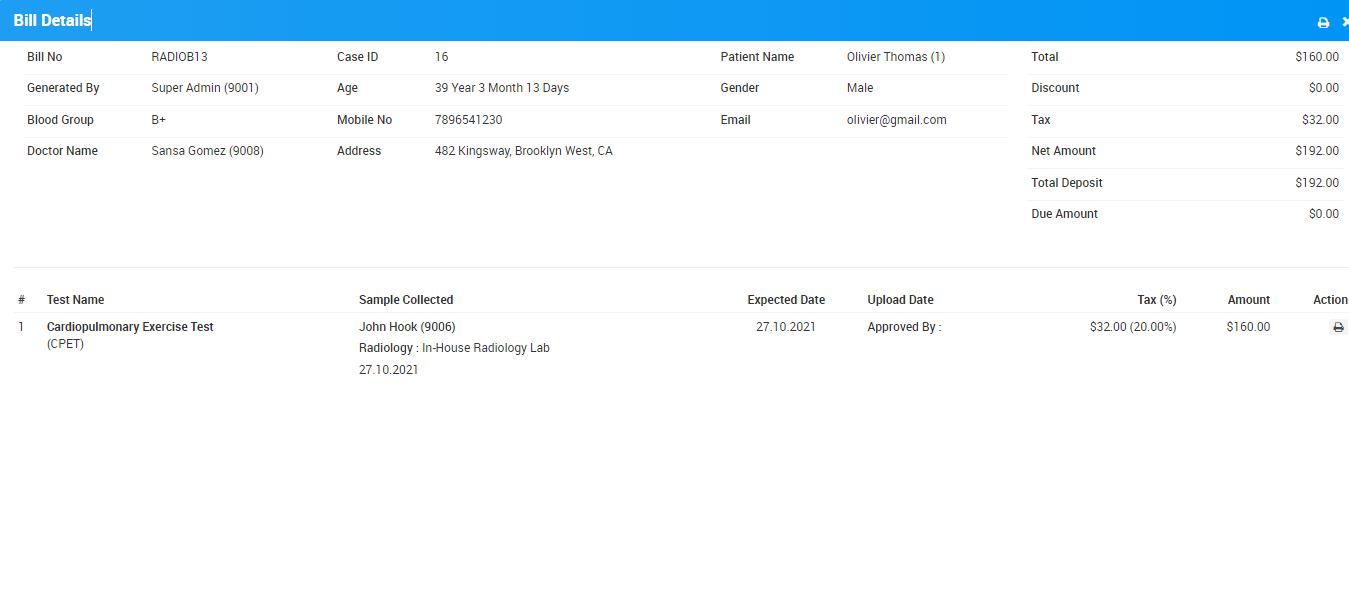 To view Radiology report bill details click on Show button present at Action column. To print bill click on print button present at top right side on the header.