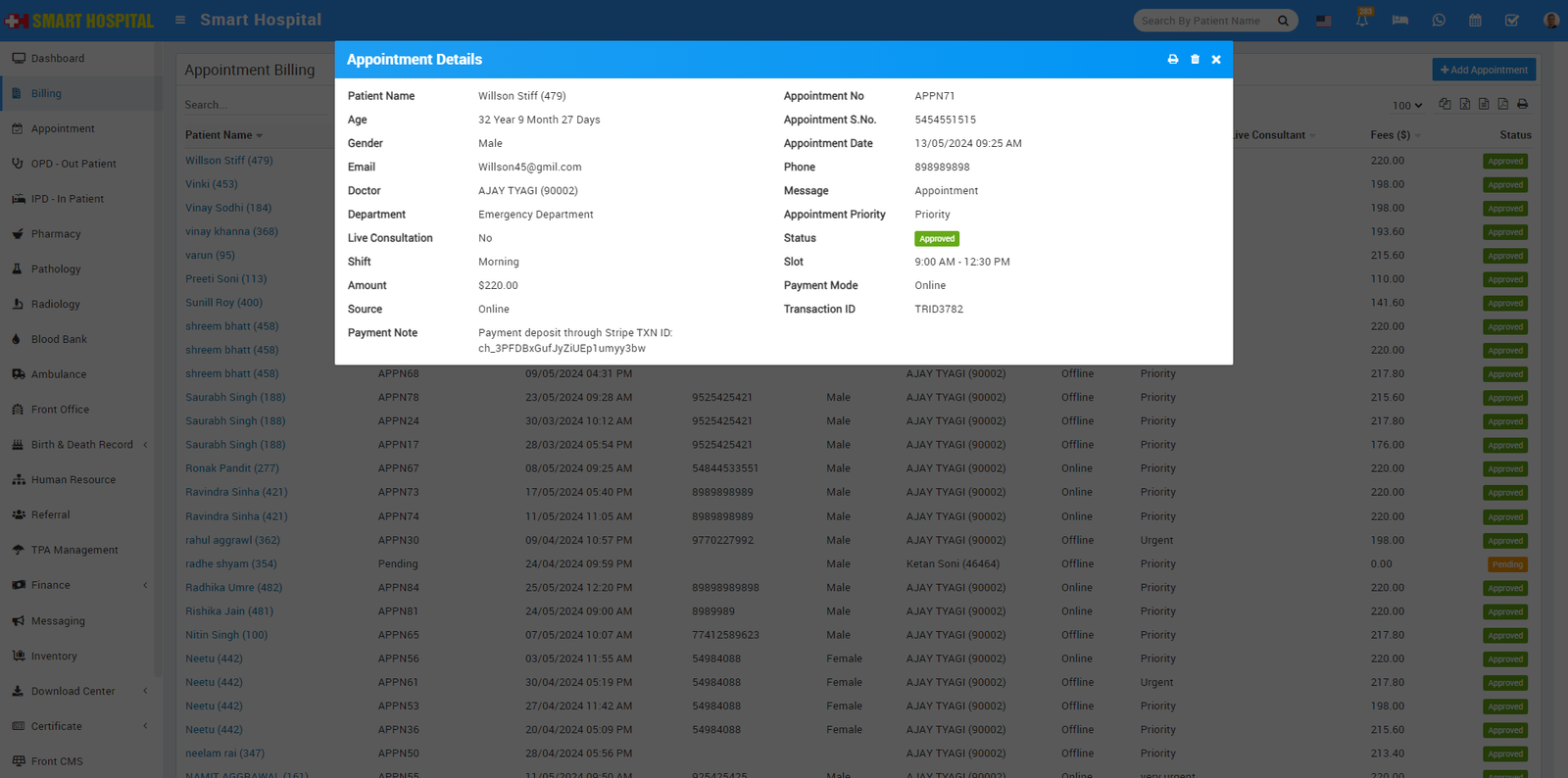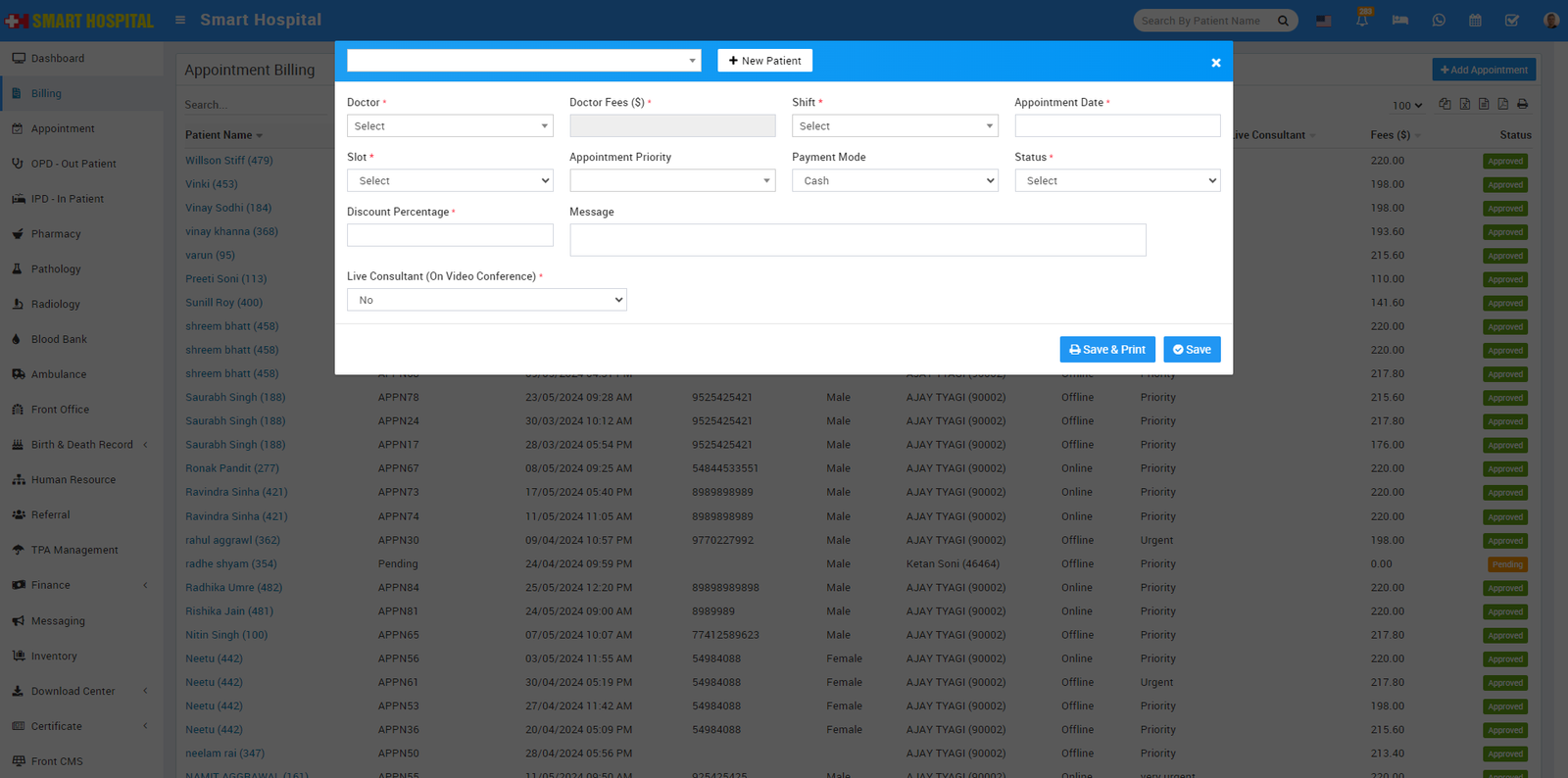 To generate patient Appointment bill go to Billing > Appointment. Here click on + Add Appointment so pop up window will be open here you should select patient from search patient field or you can add new patient from + New Patient button then select Doctor, Doctor Fees, Shift, Appointment Date, Slot, Appointment Priority, Payment Mode, Status, Message, Live Consultant, Full Details and Appointment Details then click on Save & Print or Save button. You can share this bill receipt with patient after received bill amount.