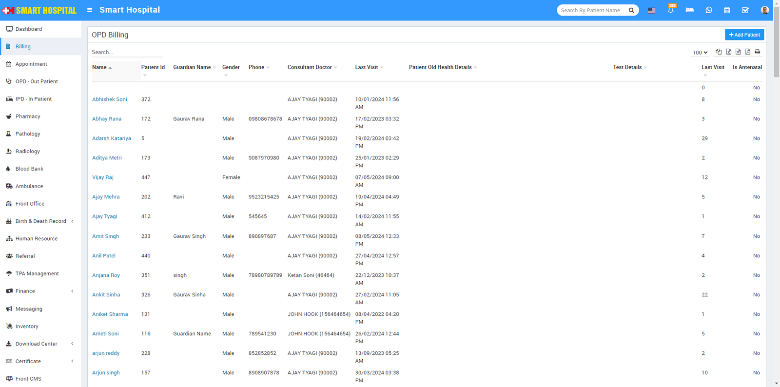 To generate patient OPD bill go to Billing > OPD. Here you can see all OPD patient visits
